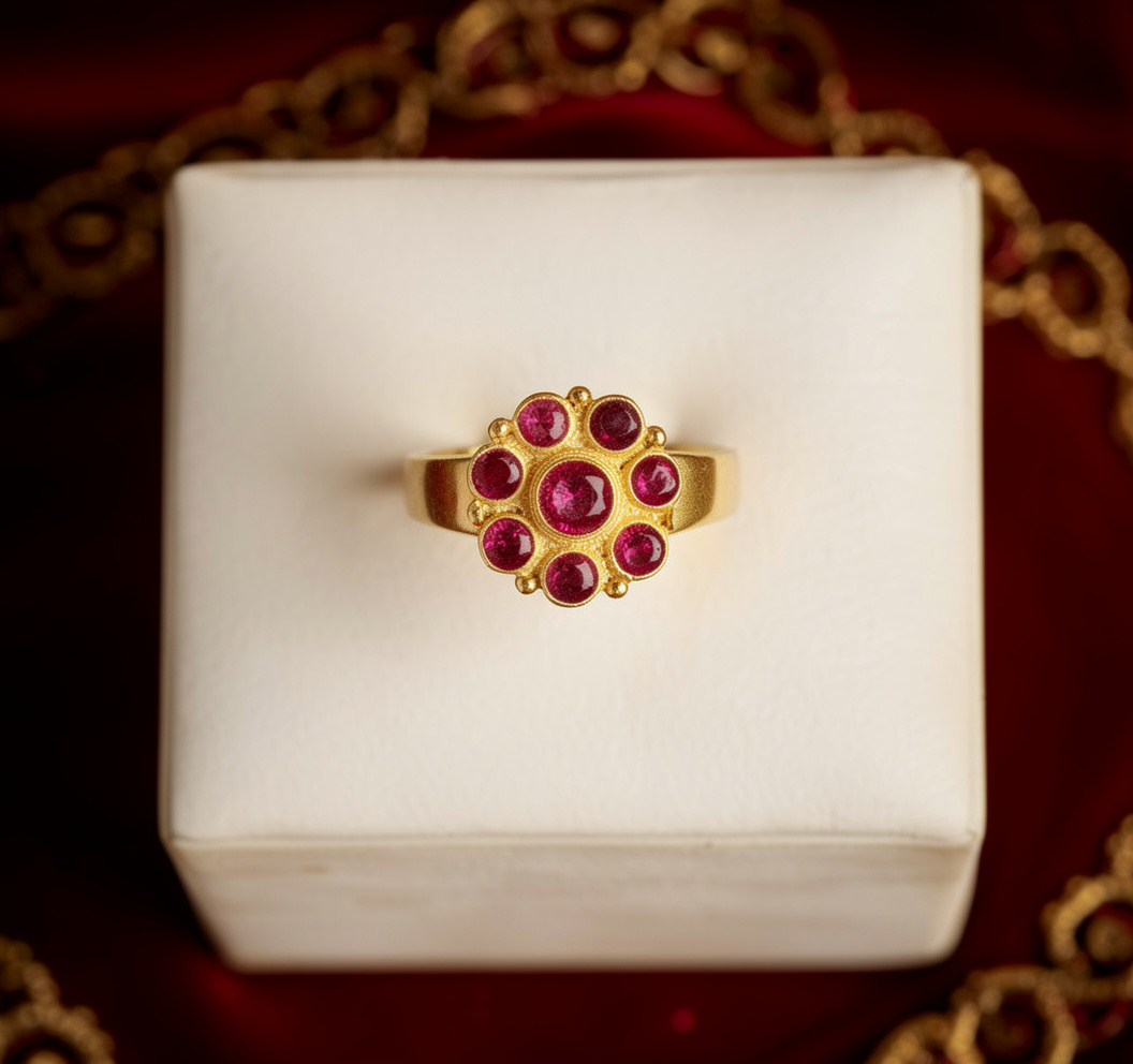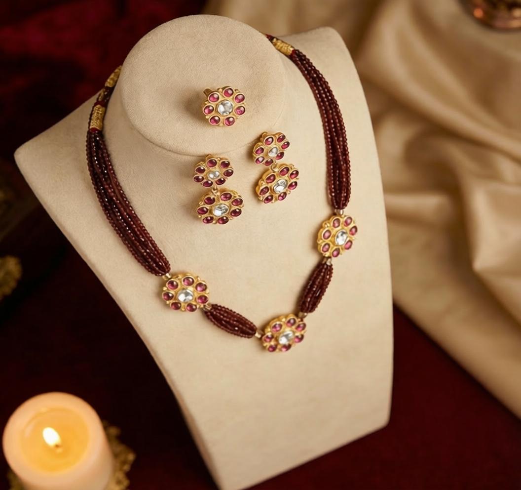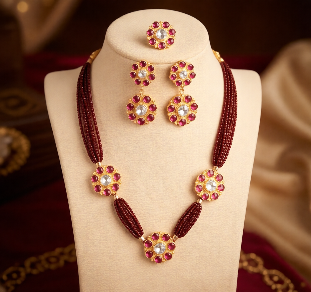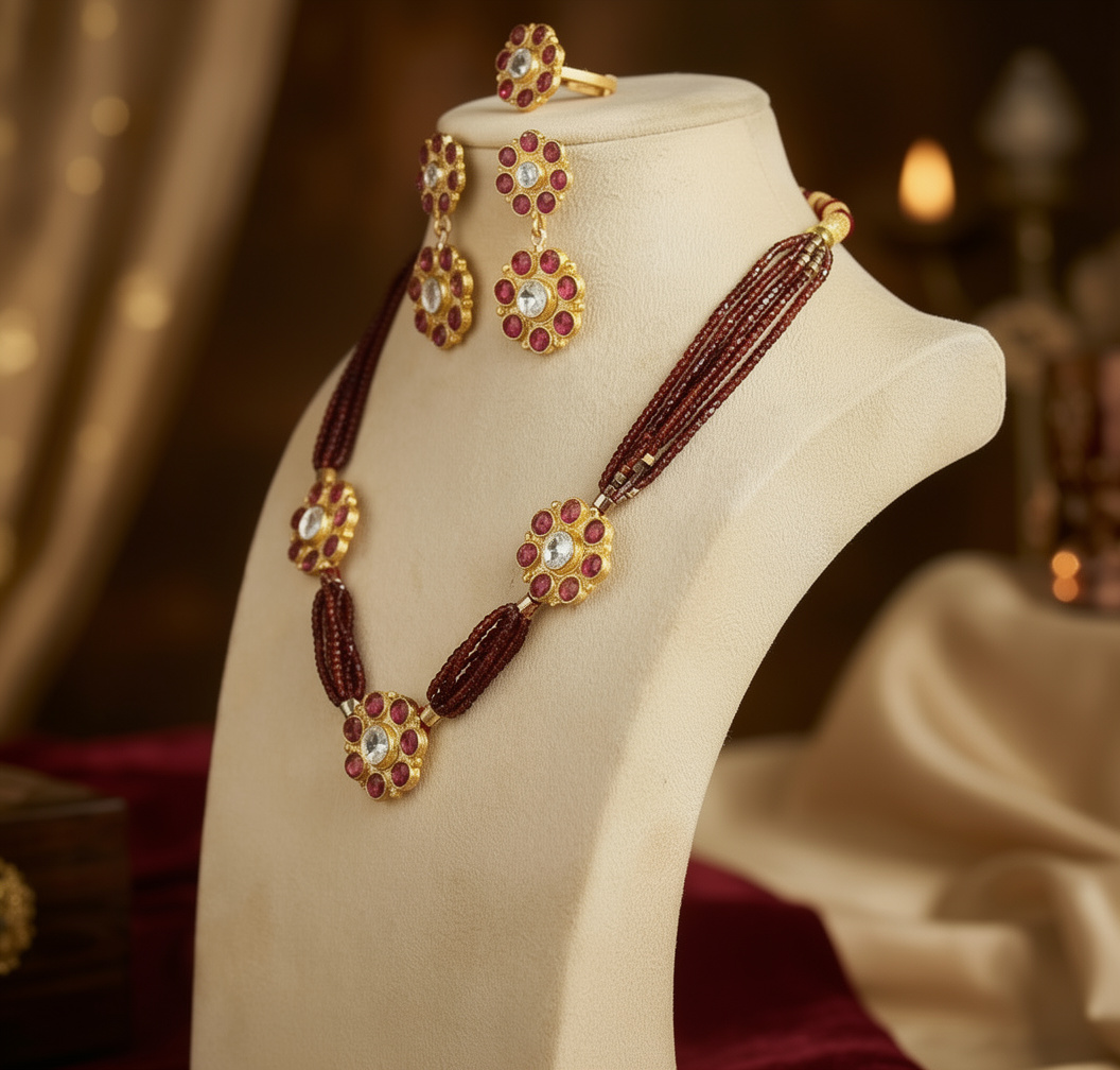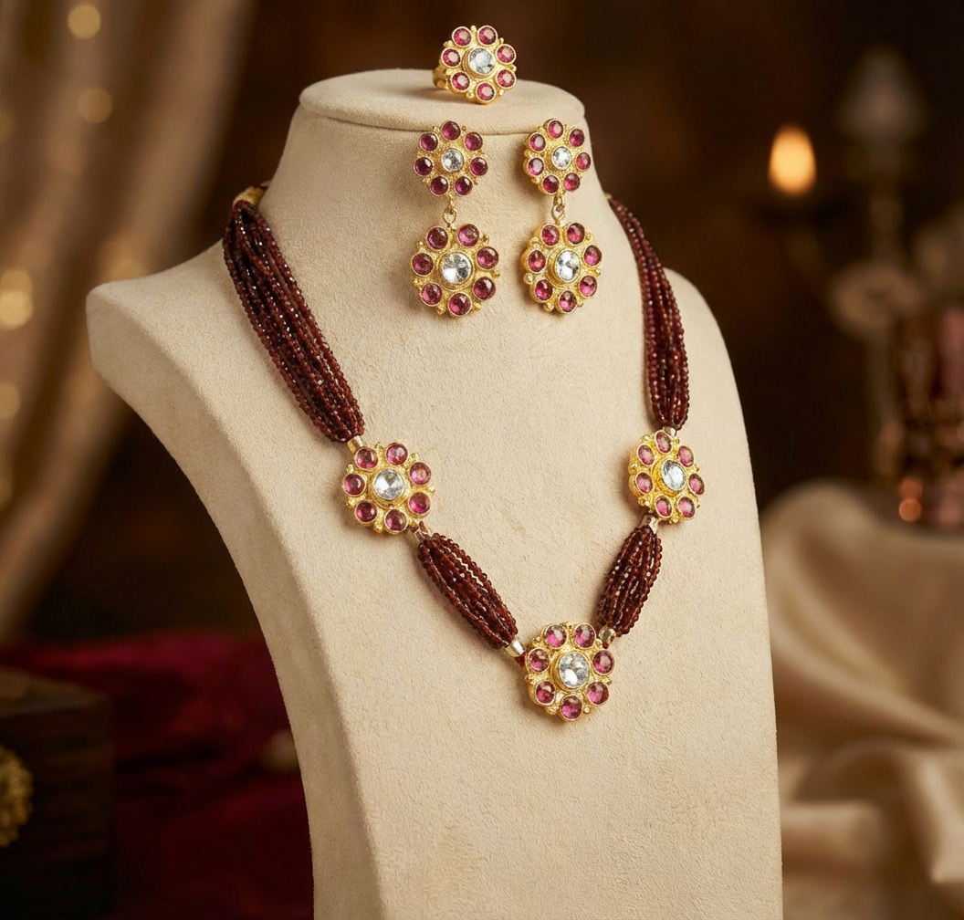 a classic Indian multi-strand necklace set, often referred to as a Matar Mala style, complete with matching earrings and a ring. It showcases a refined combination of rich crimson tones and brilliant cabution stone settings.