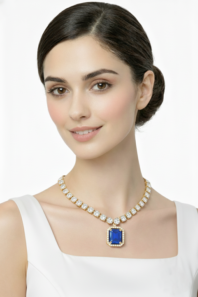The centerpiece of this ensemble is a majestic emerald-cut blue gemstone pendant, likely representing a sapphire. The deep cobalt blue stone is encased in a halo setting of shimmering white diamonds, which are mounted in a warm yellow gold frame.