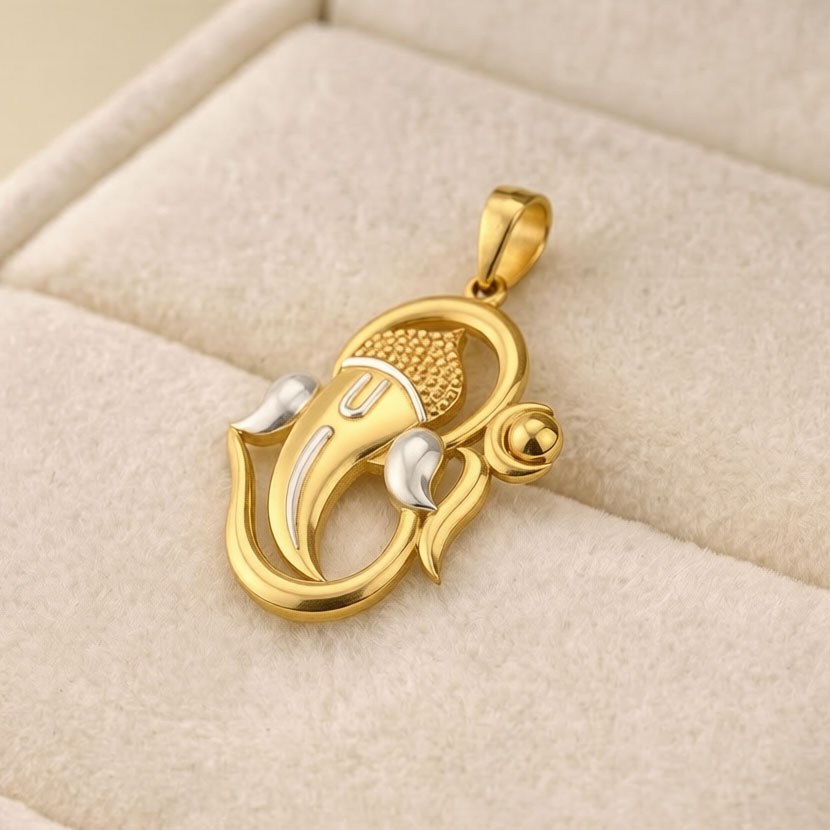 Embrace blessings and the removal of obstacles with this exquisitely crafted Lord Ganesh pendant. This sacred piece features a stylized, contemporary depiction of Ganesha, blending traditional iconography with modern artistic flair. The warm glow of yellow gold is beautifully contrasted with silver/white gold accents on the ears and trunk, symbolizing harmony and balance. It is a perfect spiritual talisman to wear daily or to gift for new beginnings.