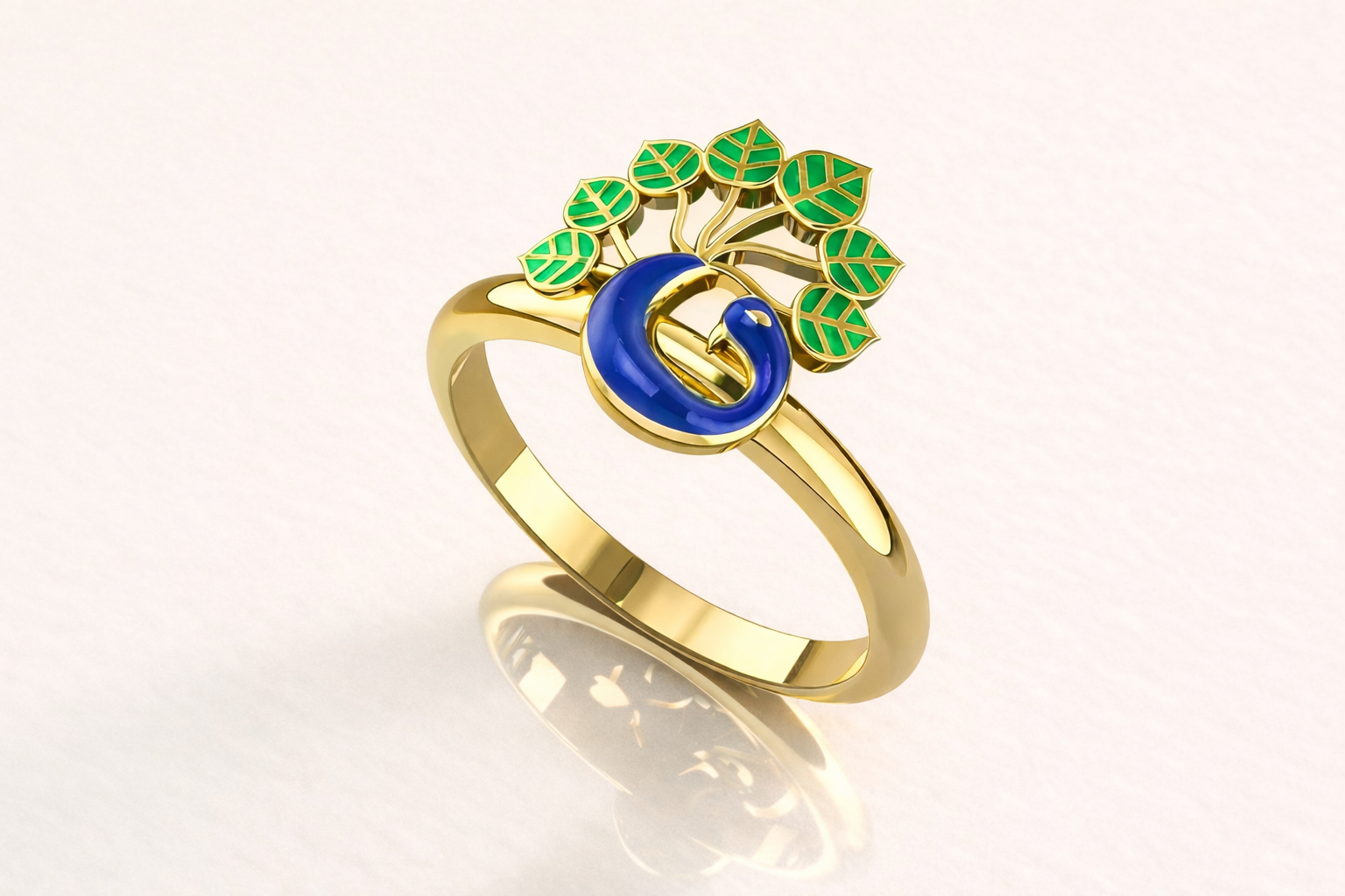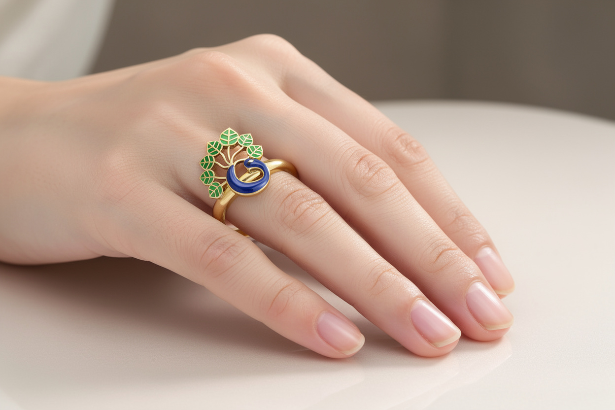 Vibrant and artistic peacock-inspired ring, blending Indian tradition with modern enameling techniques.The centerpiece is a stylized representation of a peacock, a symbol of grace, beauty, and royalty in Indian culture.