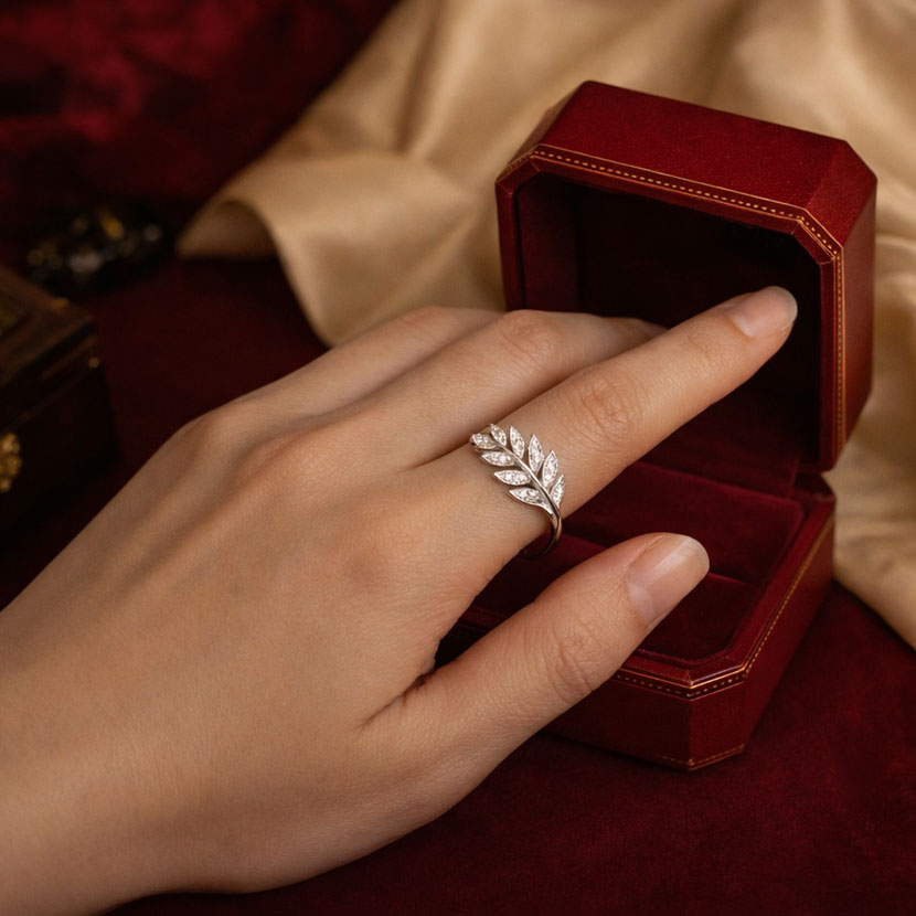 This ring is a sophisticated interpretation of a laurel or fern leaf, designed to curve gracefully along the finger. It is a perfect example of minimalist yet detailed jewelry.