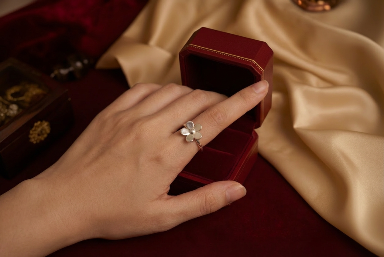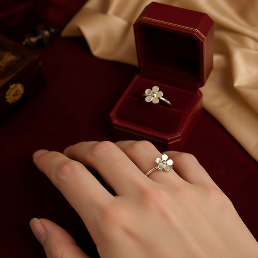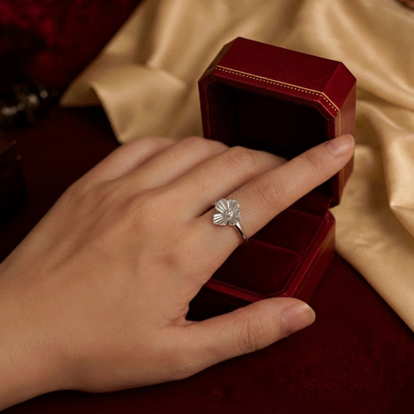 A Minimalist Five-Petal Floral Ring in Polished Silver
